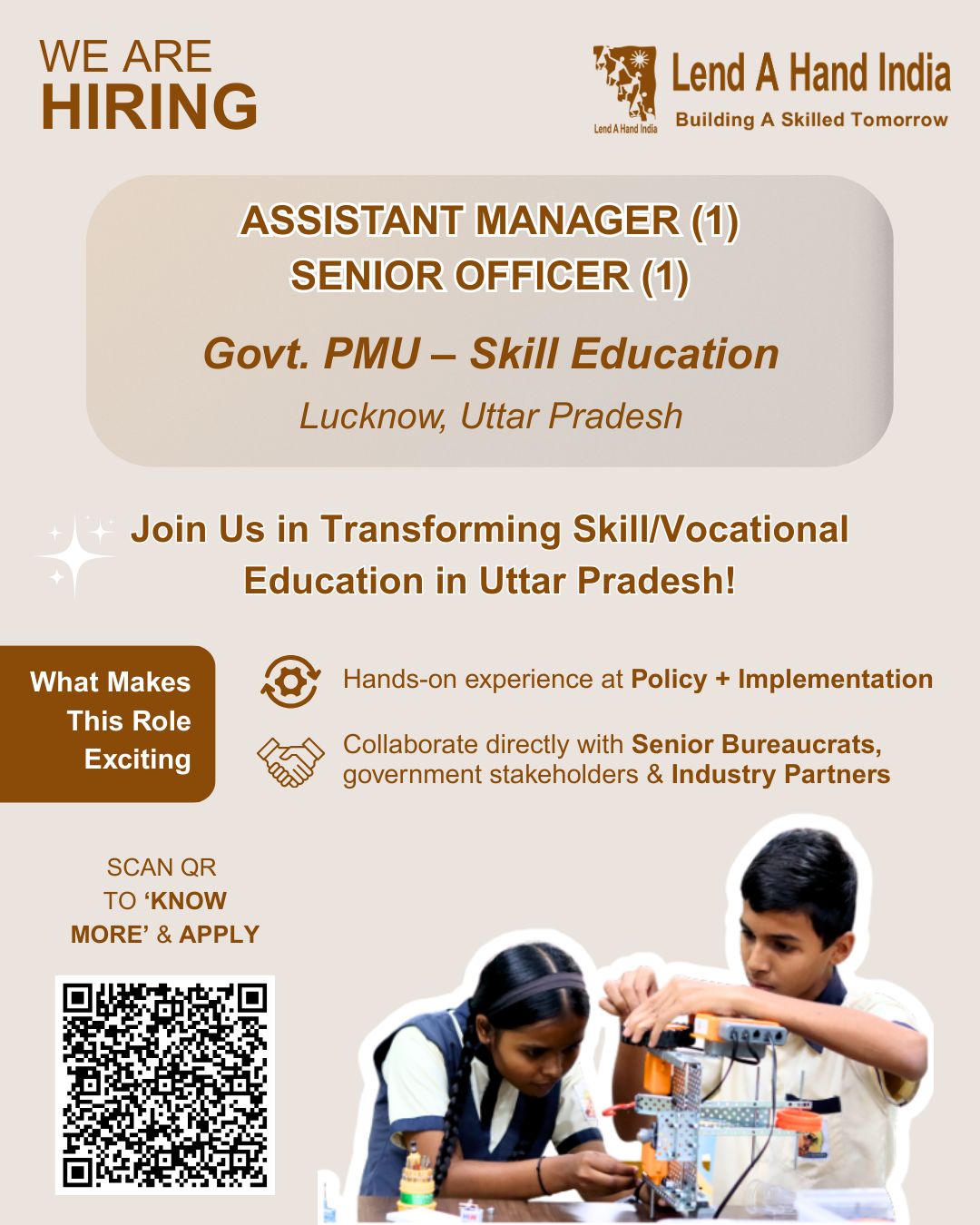 Lend A Hand India is inviting applications for two PMU roles to support the Government of Uttar Pradesh through the Directorate of Training and SCVT.
