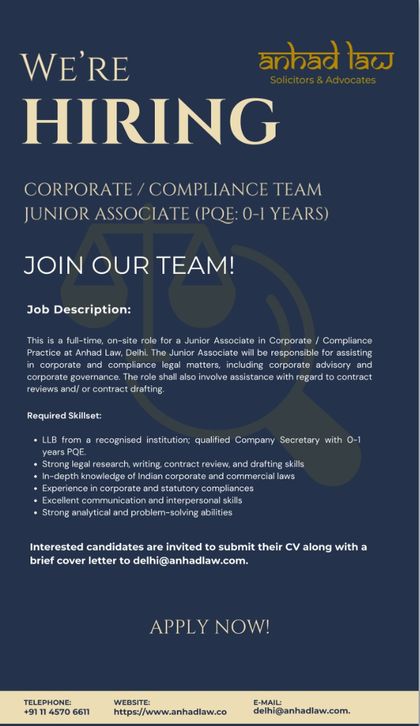 Anhad Law is inviting applications for the role of Junior Associate to join its Corporate / Compliance Practice at the New Delhi office. This opportunity is ideal for freshers and young professionals looking to build a career in corporate advisory, governance, and compliance work within a structured law firm environment.