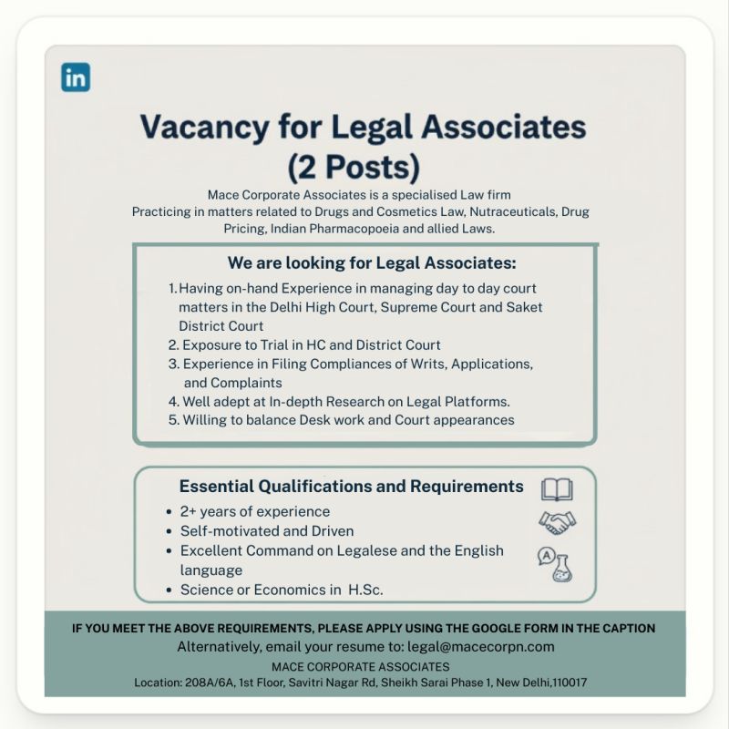 Mace Corporate Associates, a specialized law firm practicing in Drugs & Cosmetics Law, Nutraceuticals, Drug Pricing, Indian Pharmacopoeia, and allied laws, is inviting applications for 2 Legal Associate positions. The role is suitable for candidates with experience in both court appearances and desk-based legal work.