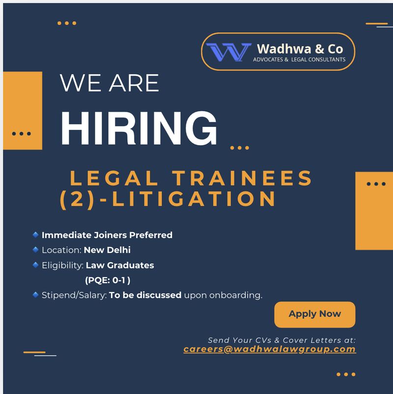 Wadhwa & Co. is inviting applications for the position of Legal Trainee(s) in its Litigation Practice at the New Delhi office. This opportunity is ideal for fresh law graduates and final-year students looking to begin their careers in litigation with hands-on exposure to court practice and legal drafting.