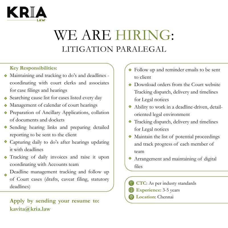 KRIA Law is seeking a proactive and highly organised Litigation Paralegal with 3–5 years of experience to join their team in Chennai. This role offers hands-on exposure to court coordination, legal documentation, and case management in a dynamic litigation environment.