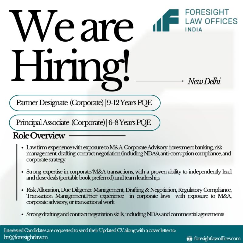 Foresight Law Offices India is inviting applications for the positions of Principal Associate and Partner Designate for its Corporate Practice in New Delhi.