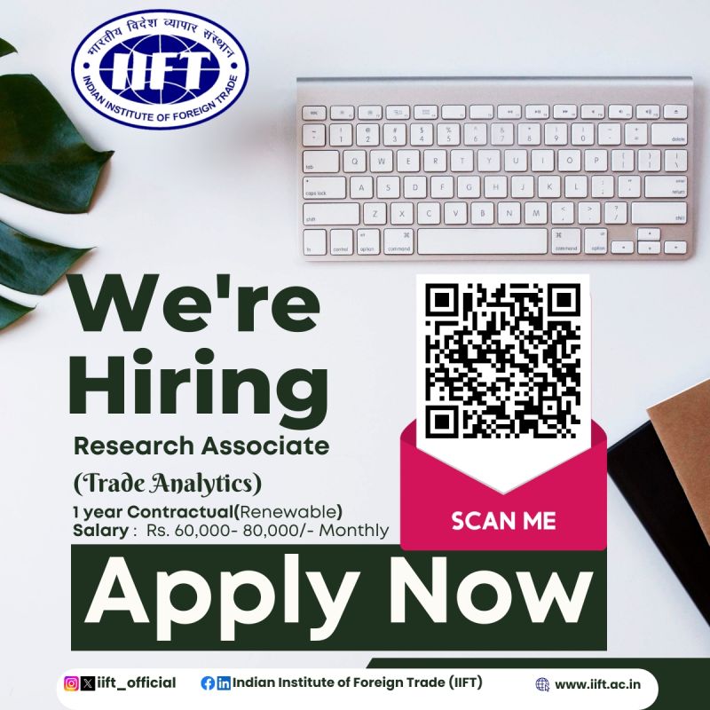 The Indian Institute of Foreign Trade (IIFT), an autonomous body under the Ministry of Commerce and Industry, Government of India, invites applications for the position of Research Associate (Trade Analytics) on a contractual basis at its New Delhi campus. This is an excellent opportunity for candidates passionate about international trade, analytics, and research-driven impact.
