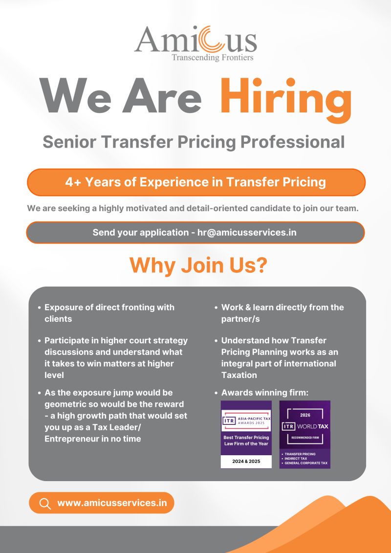 Amicus Advocates & Solicitors, a leading tax boutique firm, is inviting applications for the position of Senior Transfer Pricing Professional (Manager Level). The role is suited for candidates with strong expertise in Transfer Pricing who are looking to work on complex domestic and international TP matters, advisory, documentation, and litigation support.