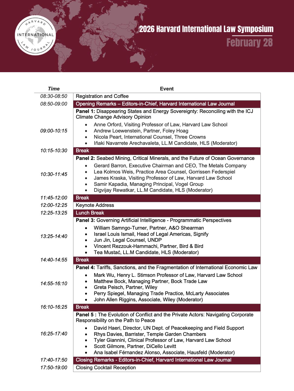 The Symposium will feature timely and rigorous discussions on the evolving landscape of international law amid significant global shifts. Attendees will also have the opportunity to engage informally with speakers and peers over breakfast, lunch, and a closing cocktail reception.