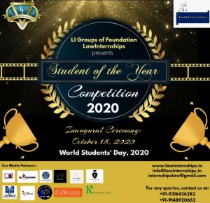 On the occasion of World Student’s Day, LI Groups of Foundation and LawInternships is organizing its 1st and one of its kind Student of the year Competition, 2020, a comprehensive process specifically curated to evaluate each law student solely on the basis of their caliber and buildout. This competition aims at giving due credit to the student for its academic and non-academic excellence in the fields where they have left their mark.
