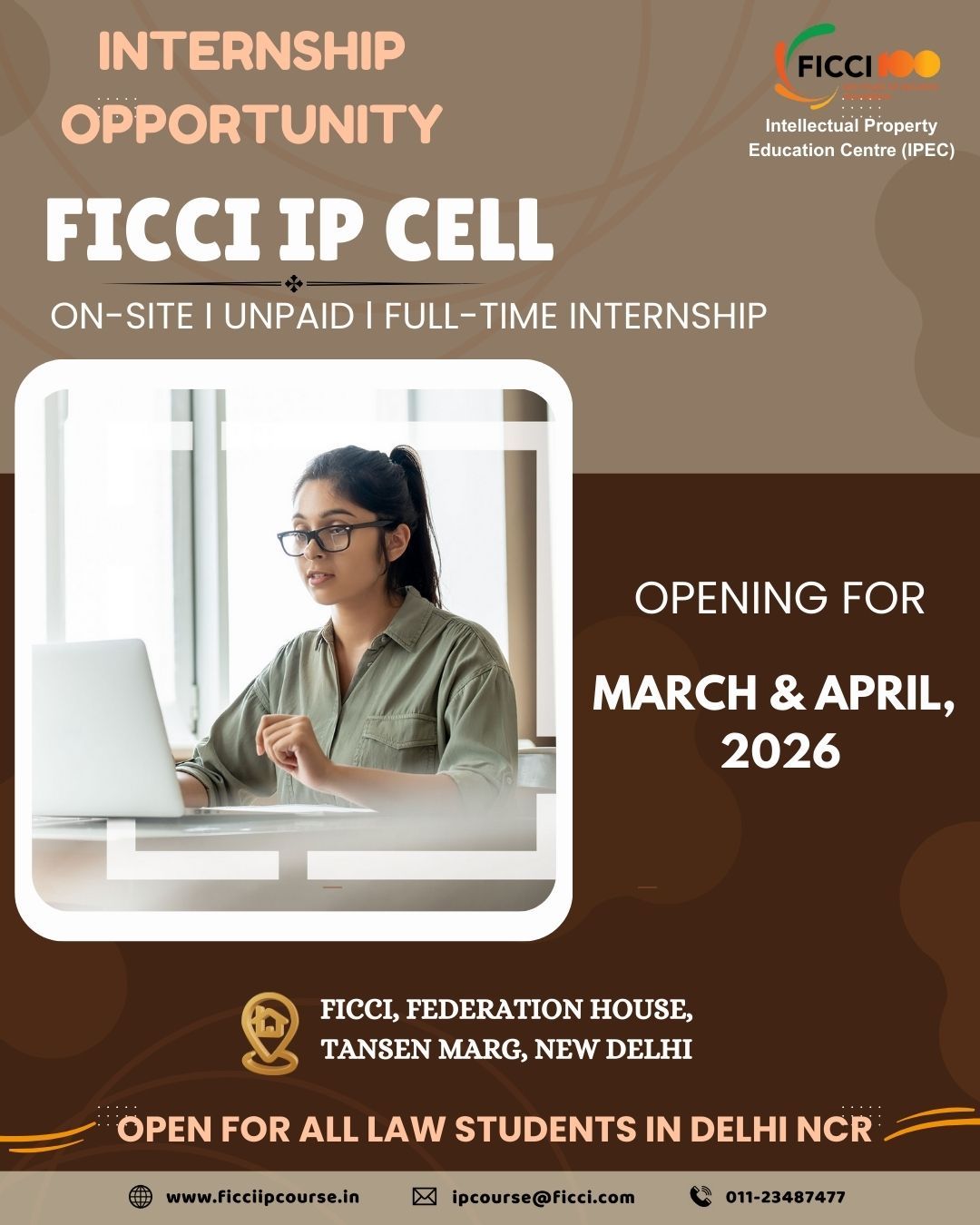 FICCI IP Cell is inviting applications from law students based in the Delhi NCR for an on-site, unpaid internship during March–April 2026.