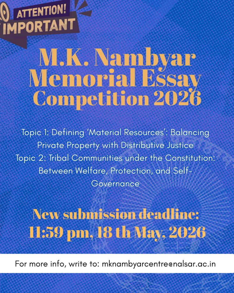 The M.K. Nambyar SAARC Law Centre for Advanced Legal Studies at NALSAR University of Law, Hyderabad has announced an extension of the submission deadline for the M.K. Nambyar Memorial Essay Competition, 2026. The competition invites law students to engage with contemporary constitutional and socio-legal themes, encouraging analytical and comparative perspectives within the South Asian context.