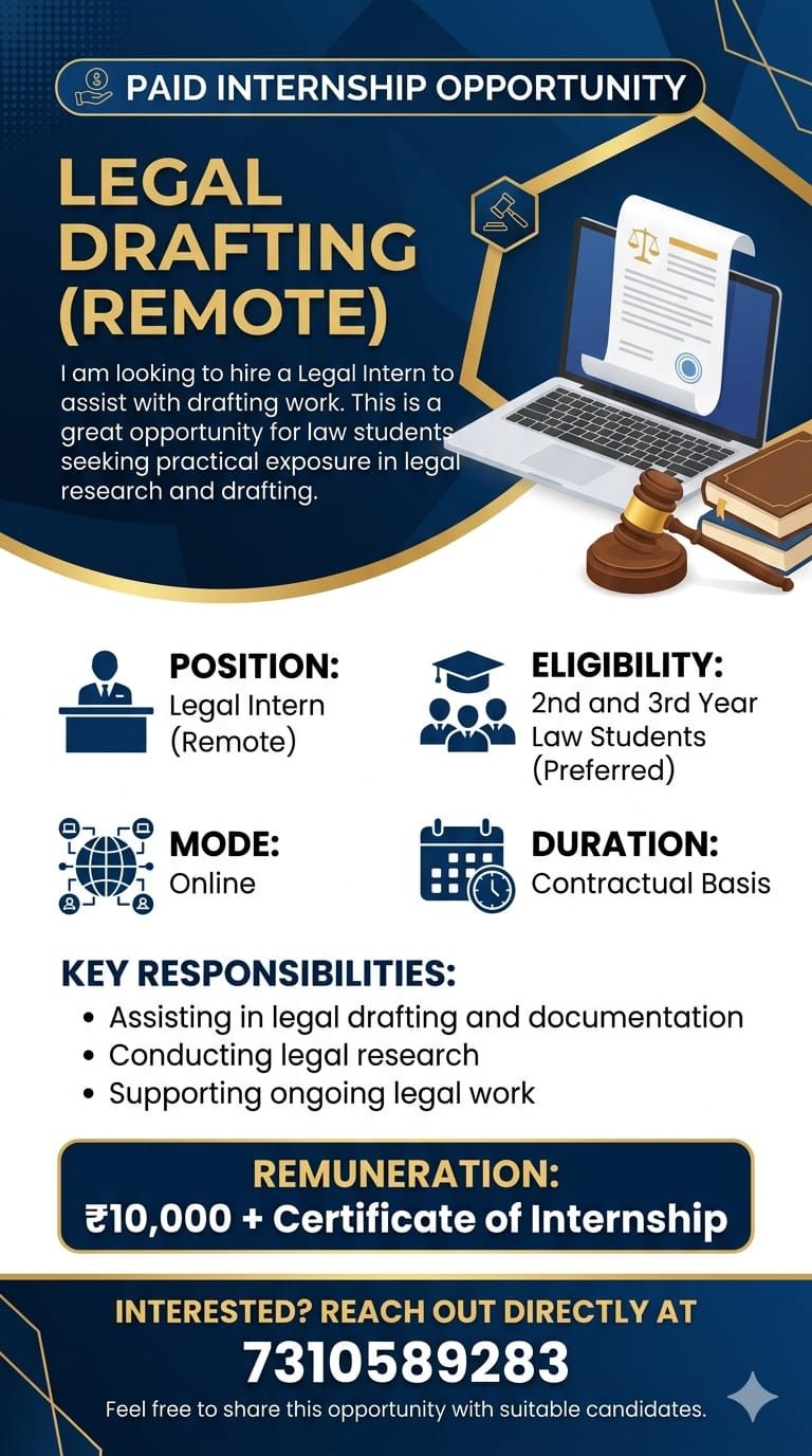 Applications are invited for a Remote Legal Internship focused on legal drafting and research. This is a practical opportunity for law students to gain hands-on experience working on real legal assignments.