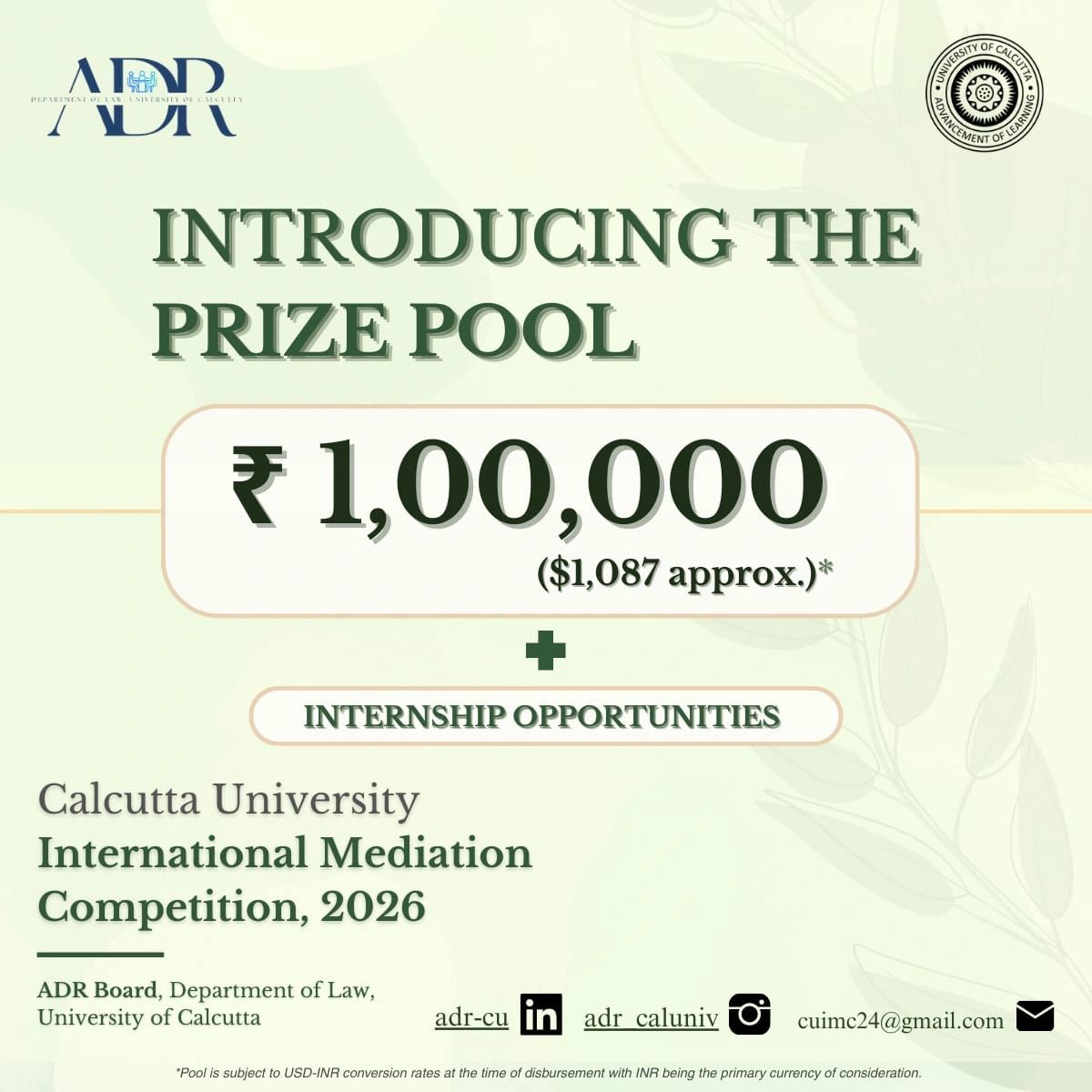 The ADR Board, Department of Law, University of Calcutta has officially unveiled the prize pool for the Calcutta University International Mediation Competition (CUIMC) 2026.