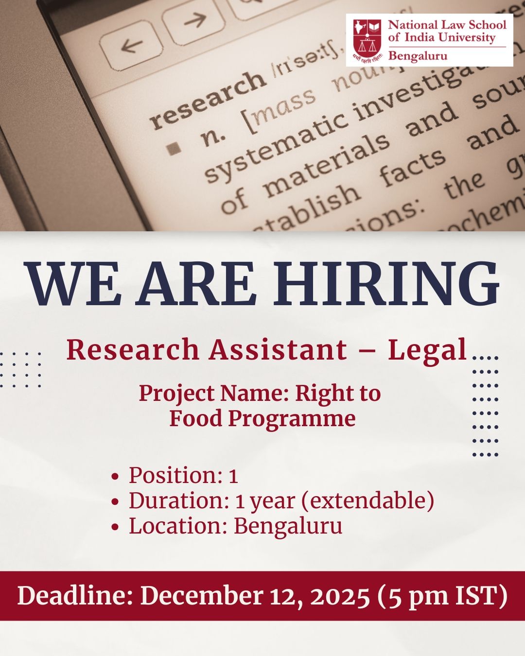 The National Law School of India University Bengaluru is inviting applications for the position of Research Assistant Legal under the Right to Food Programme. This role is suited for individuals who wish to engage deeply with issues of food security, social welfare entitlements and the legal frameworks that govern access to nutrition and state responsibility. The project provides an opportunity to participate in research that has the potential to influence policy, strengthen accountability mechanisms and contribute to ongoing academic and field based interventions related to the right to food.