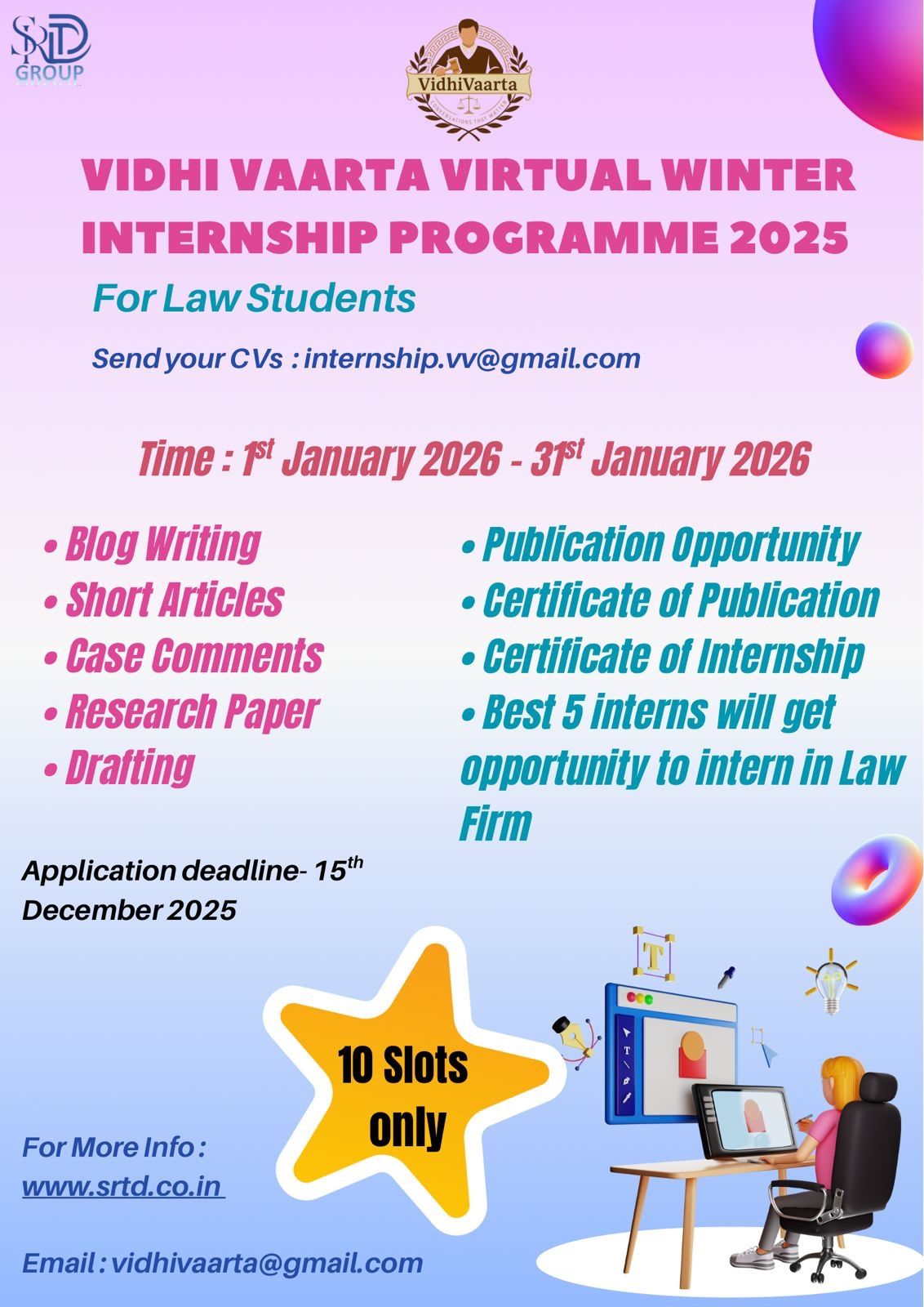 The deadline to apply is 15 December 2025. Interested candidates must send their updated CV to internship.vv@gmail.com using the subject line Application for Virtual Winter Internship 2025. For further details, applicants may refer to the official sources and social platforms provided by Vidhi Vaarta.